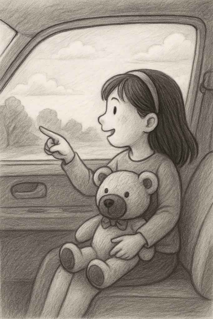 Yumi sat snugly in the passenger seat of her father’s car, placing me gently on her lap,