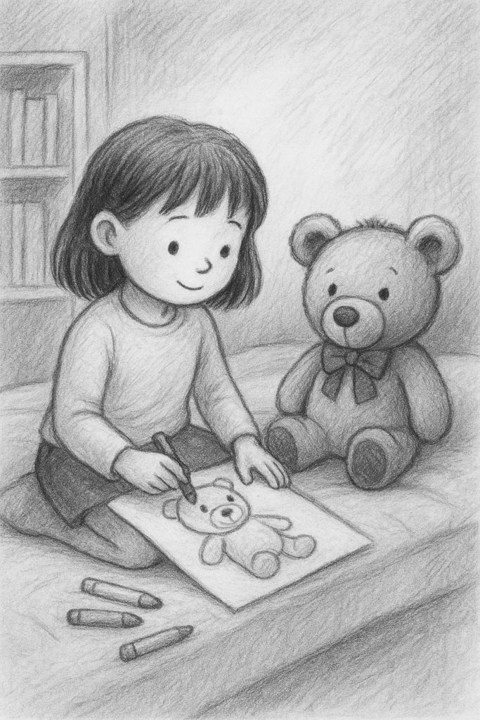 Now and then, she glanced up at me, then picked up a red crayon and drew the ribbon around my neck.