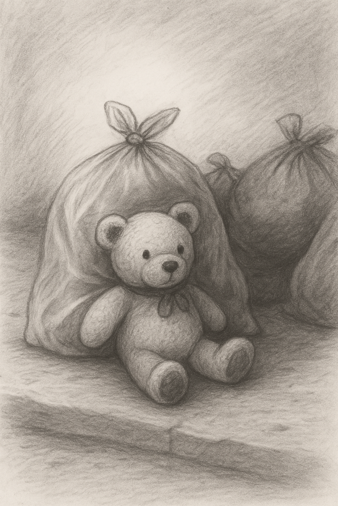 The garbage truck stopped in front of Yumi’s house picked up an old teddy bear and the rest of the trash bags left on the doorstep, then drove away in a hurry.
